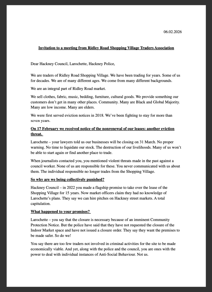 For more information, read traders’ open letter to Hackney Council, the landlord and Hackney Police below.