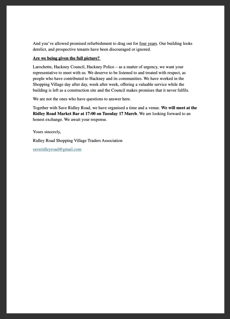 Successful, community-led regeneration is possible with the will and imagination, as we see from Seven Sisters Indoor Market and across London. Larochette have proved incapable of behaving with legal or social responsibility to their tenants. Hackney Council need to step up, intervene and get the 2022 agreement back on track and Mayor Woodley should be taking personal responsibility.