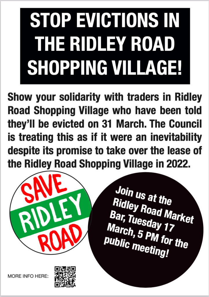 Join us at the Ridley Road Market Bar, 5 p.m., Tues 17 March for the public meeting.
