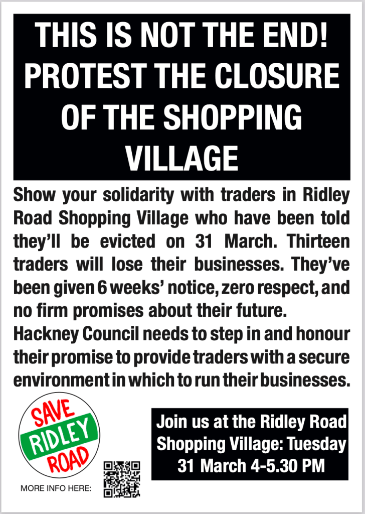 The Ridley Road Shopping Village will be shuttered at the end of trading at 5 p.m. Tuesday 31 March. Thirteen traders will lose their businesses. They’ve been given 6 weeks’ notice, zero respect, and no firm promises about their future.